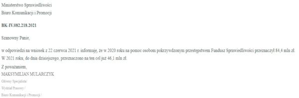 „W odpowiedzi na wniosek z 22 czerwca 2021 r. informuję, że w 2020 roku na pomoc osobom pokrzywdzonym przestępstwem Fundusz Sprawiedliwości przeznaczył 84,4 mln zł. W 2021 roku, do dnia dzisiejszego, przeznaczono na ten cel już 46,1 mln zł” - poinformowało Ministerstwo Sprawiedliwości.