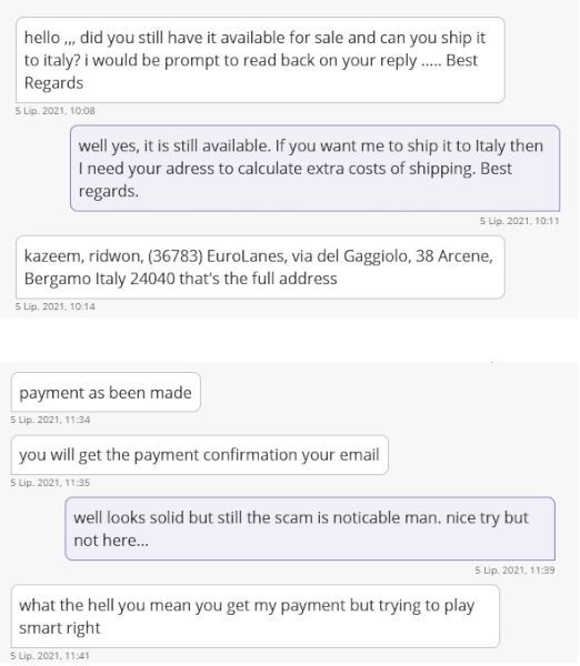 po nawiązaniu kontaktu dopytują o możliwość wysyłki zagranicę, która najczęściej oznacza sprzedaż poza polskim serwisem aukcyjnym