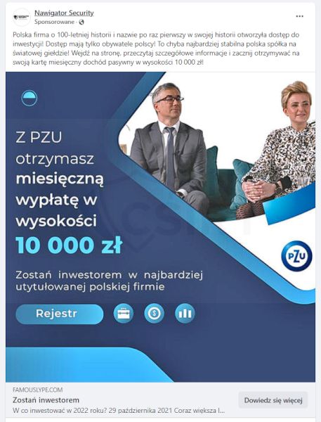 „Uwaga na kolejne oszustwo inwestycyjne w nowej odsłonie! W tym przypadku cyberprzestępcy podszywają się pod Grupę PZU i publikują fałszywe reklamy w mediach społecznościowych oferujące szybkie zyski. Nie dajcie się zwieść – to kolejny sposób, aby pozbawić Was oszczędności!” - napisano w twitterowym wpisie CSIRT KNF, czyli Zespołu Reagowania na Incydenty Bezpieczeństwa Komputerowego polskiego sektora finansowego działającego przy Komisji Nadzoru Finansowego. Instytucja opublikowała też przykładowe „reklamy” autorstwa oszustów: